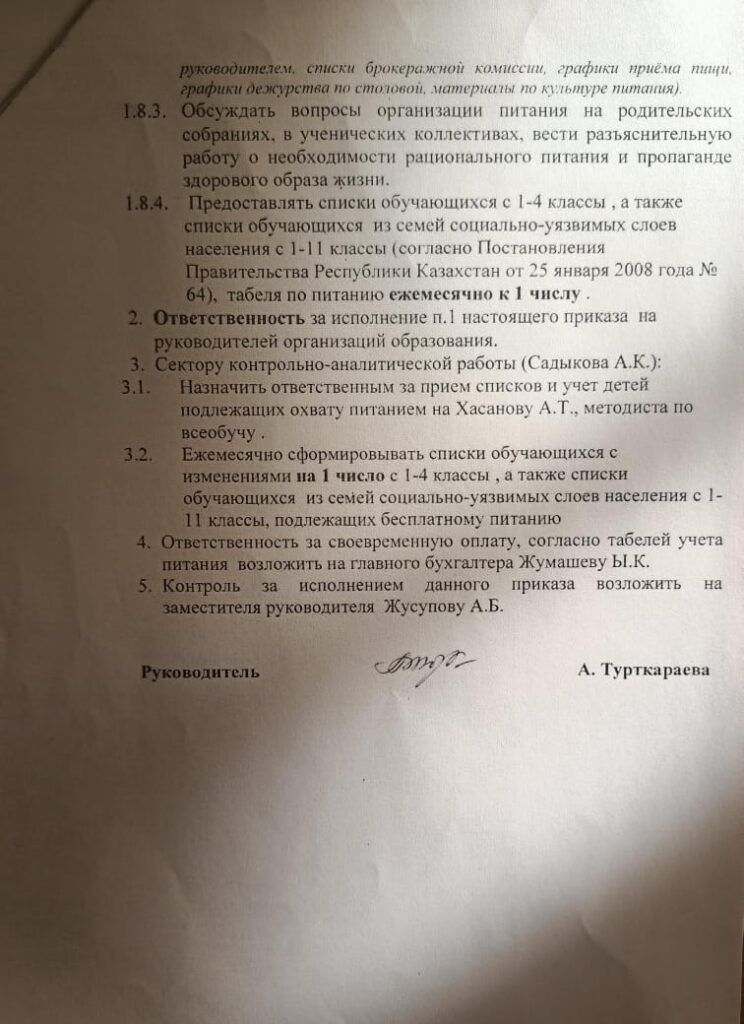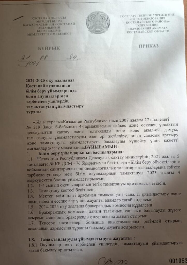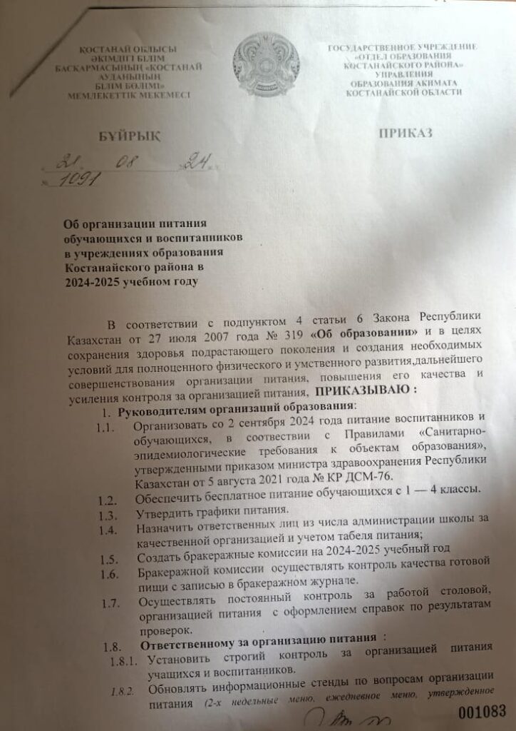 НовостиОрганизация питания 2024-2025 оқу жылына студенттерді тамақтандыруды ұйымдастыру туралы бұйрық / Приказ об организации питания обучающихся на 2024-2025 учебный год 04.11.2024 molokanov